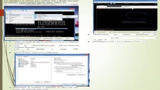 The document discusses security in database systems. It covers topics like leaving the virtual machine network adapter in bridge mode, configuring Kali Linux for DNS spoofing attacks, modifying configuration files like etter.conf and etter.dns, scanning for hosts on the network, and initiating ARP poisoning and DNS spoofing attacks using Ettercap to redirect traffic to a malicious IP address. The document also provides information about the Optix Pro 1.3 trojan horse program and its ability to install backdoors and remotely control infected systems.