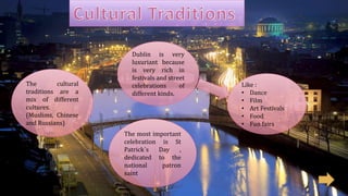 The document summarizes cultural traditions and celebrations in Dublin, Ireland. Dublin has a mix of cultural influences from Muslims, Chinese, and Russians. It is very rich in festivals and street celebrations focused around dance, film, art, food, and fun fairs. The most important celebration is St. Patrick's Day, which honors the national patron saint. Festivals celebrate the diverse cultures that make up Dublin's cultural traditions.