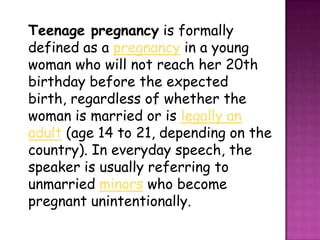 Teenage pregnancy is defined as a pregnancy in a woman under 20 years old. It can be caused by early marriage in some cultures where it is seen as proof of fertility. In other societies, lack of education about contraception and pressure to have sex can lead to unintended teenage pregnancy. While most teenage pregnancies in developed nations are unplanned, some teens deliberately get pregnant. One way to address this issue is through a public awareness campaign that informs teens of the responsibilities of pregnancy without telling them to abstain from sex, encouraging them to think about what they really want for their future.