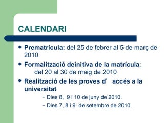 CALENDARI Prematrícula: del 25 de febrer al 5 de març de 2010 Formalització deinitiva de la matrícula : del 20 al 30 de maig de 2010 Realització de les proves d ’ accés a la universitat Dies 8, 9 i 10 de juny de 2010. Dies 7, 8 i 9 de setembre de 2010.