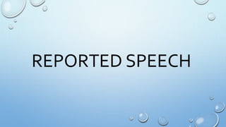 This document provides information about reported speech and examples of how to change direct speech into reported speech. It discusses how reported speech does not use the speaker's exact words but rather reports what another person has said. It explains that the structure is a little different depending on whether you are transforming a statement, question, or request. Examples are provided of direct speech using quotation marks and how it would be changed to reported speech without quotation marks.