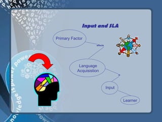 The document discusses the role of input and interaction in second language acquisition (SLA), highlighting Stephen Krashen's input hypothesis, which emphasizes the importance of comprehensible input for effective language learning. It also explores the significance of interaction in the learning process, positing that communication aids language development by fostering negotiation of meaning and providing feedback. Additionally, the document addresses concepts like teacher talk, foreigner talk, and error analysis in the context of language education.