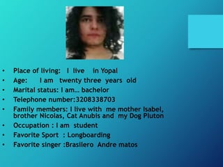 A 23-year-old bachelor from Yopal lives with his mother Isabel, brother Nicolas, cat Anubis and dog Pluton. He is a student who enjoys longboarding in his free time and lists Brazilian singer Andre Matos as his favorite musician.