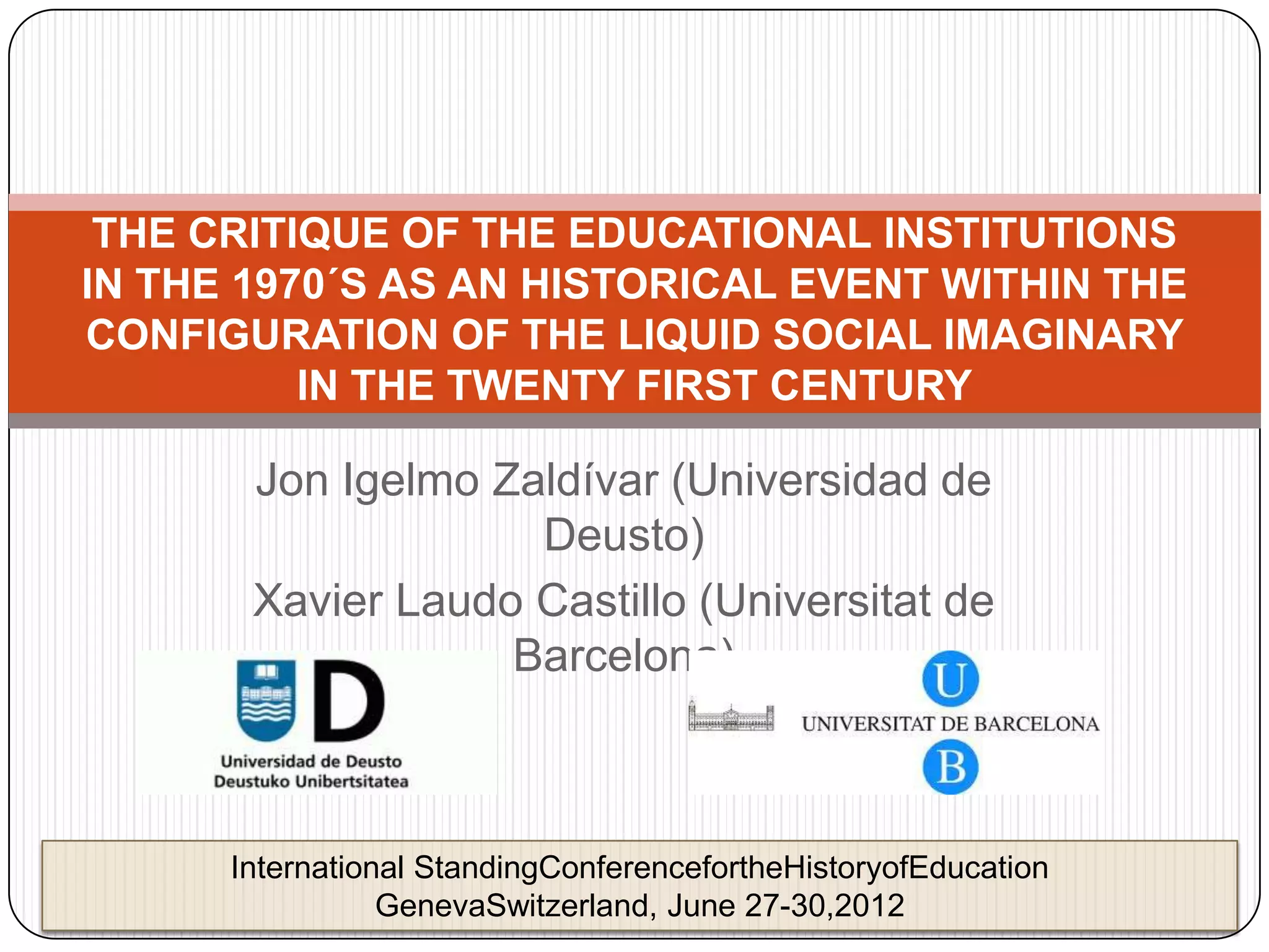 This document discusses the critique of educational institutions in the 1970s and its relationship to theories of "liquid pedagogy" and "deschooling" in the 21st century. It argues that the critique of schools in the 1970s both reflected and contributed to the emergence of a new social imaginary characterized by distrust in large educational institutions. Further, it claims that liquid pedagogy has its roots in deschooling theories from the 1970s, though the relationship is one of "homothetic transformation" rather than a straight line. The document analyzes how these critiques and theories can provide new historical perspectives on changes in education.