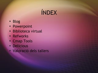 ÍNDEX Blog PowerpointBiblioteca virtual Refworks Cmap Tools Delicious Valoraci ó dels tallers