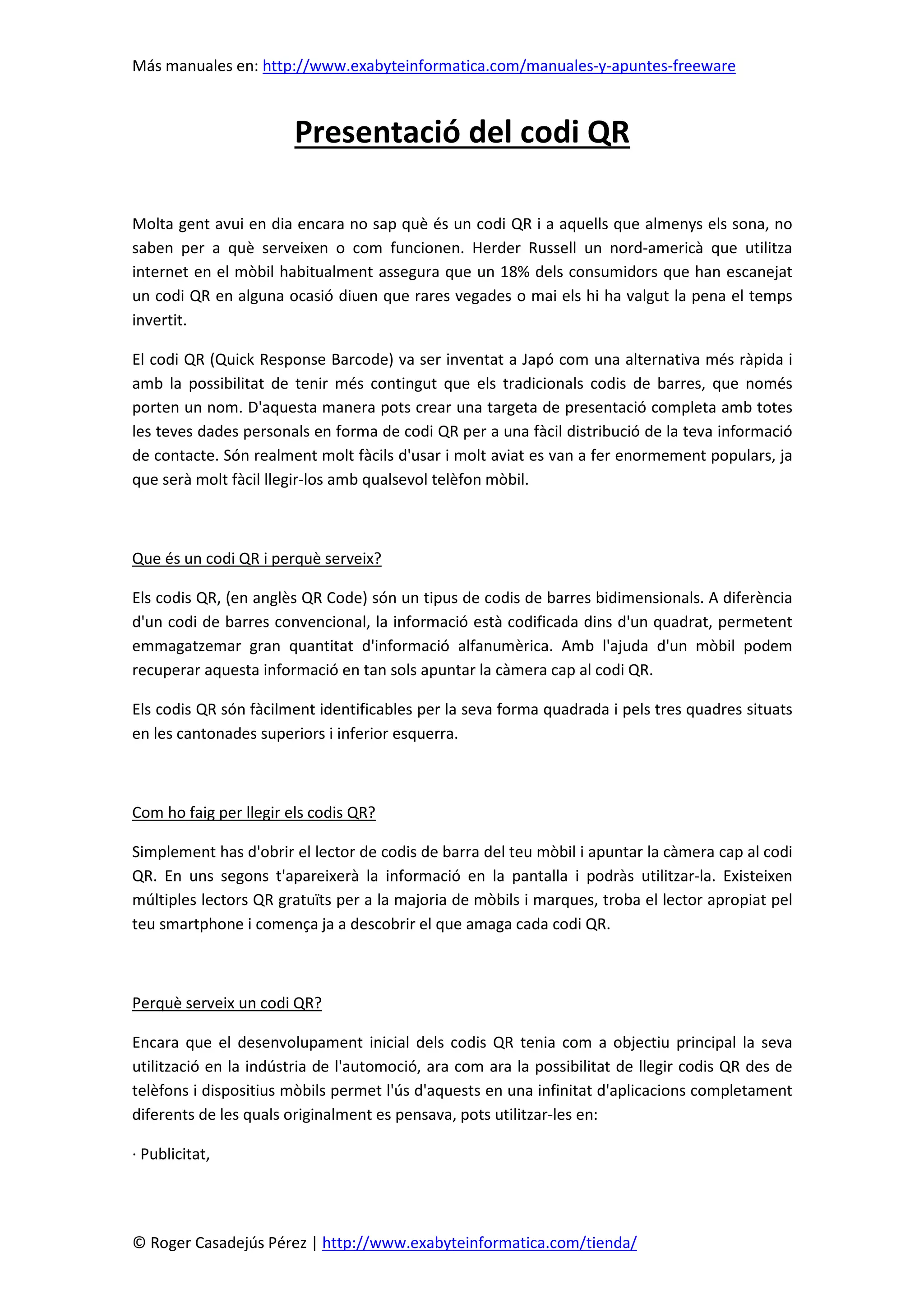 http://www.exabyteinformatica.com/manuales-y-apuntes-freeware © Roger Casadejús Pérez | http://www.exabyteinformatica.com/tienda/ Presentació del codi QR Molta gent avui en dia encara no sap què és un codi QR i a aquells que almenys els sona, no saben per a què serveixen o com funcionen. Herder Russell un nord-americà que utilitza internet en el mòbil habitualment assegura que un 18% dels consumidors que han escanejat un codi QR en alguna ocasió diuen que rares vegades o mai els hi ha valgut la pena el temps invertit. El codi QR (Quick Response Barcode) va ser inventat a Japó com una alternativa més ràpida i amb la possibilitat de tenir més contingut que els tradicionals codis de barres, que només porten un nom. D'aquesta manera pots crear una targeta de presentació completa amb totes les teves dades personals en forma de codi QR per a una fàcil distribució de la teva informació de contacte. Són realment molt fàcils d'usar i molt aviat es van a fer enormement populars, ja que serà molt fàcil llegir-los amb qualsevol telèfon mòbil. Que és un codi QR i perquè serveix? Els codis QR, (en anglès QR Code) són un tipus de codis de barres bidimensionals. A diferència d'un codi de barres convencional, la informació està codificada dins d'un quadrat, permetent emmagatzemar gran quantitat d'informació alfanumèrica. Amb l'ajuda d'un mòbil podem recuperar aquesta informació en tan sols apuntar la càmera cap al codi QR. Els codis QR són fàcilment identificables per la seva forma quadrada i pels tres quadres situats en les cantonades superiors i inferior esquerra. Com ho faig per llegir els codis QR? Simplement has d'obrir el lector de codis de barra del teu mòbil i apuntar la càmera cap al codi QR. En uns segons t'apareixerà la informació en la pantalla i podràs utilitzar-la. Existeixen múltiples lectors QR gratuïts per a la majoria de mòbils i marques, troba el lector apropiat pel teu smartphone i comença ja a descobrir el que amaga cada codi QR. Perquè serveix un codi QR? Encara que el desenvolupament inicial dels codis QR tenia com a objectiu principal la seva utilització en la indústria de l'automoció, ara com ara la possibilitat de llegir codis QR des de telèfons i dispositius mòbils permet l'ús d'aquests en una infinitat d'aplicacions completament diferents de les quals originalment es pensava, pots utilitzar-les en: · Publicitat,