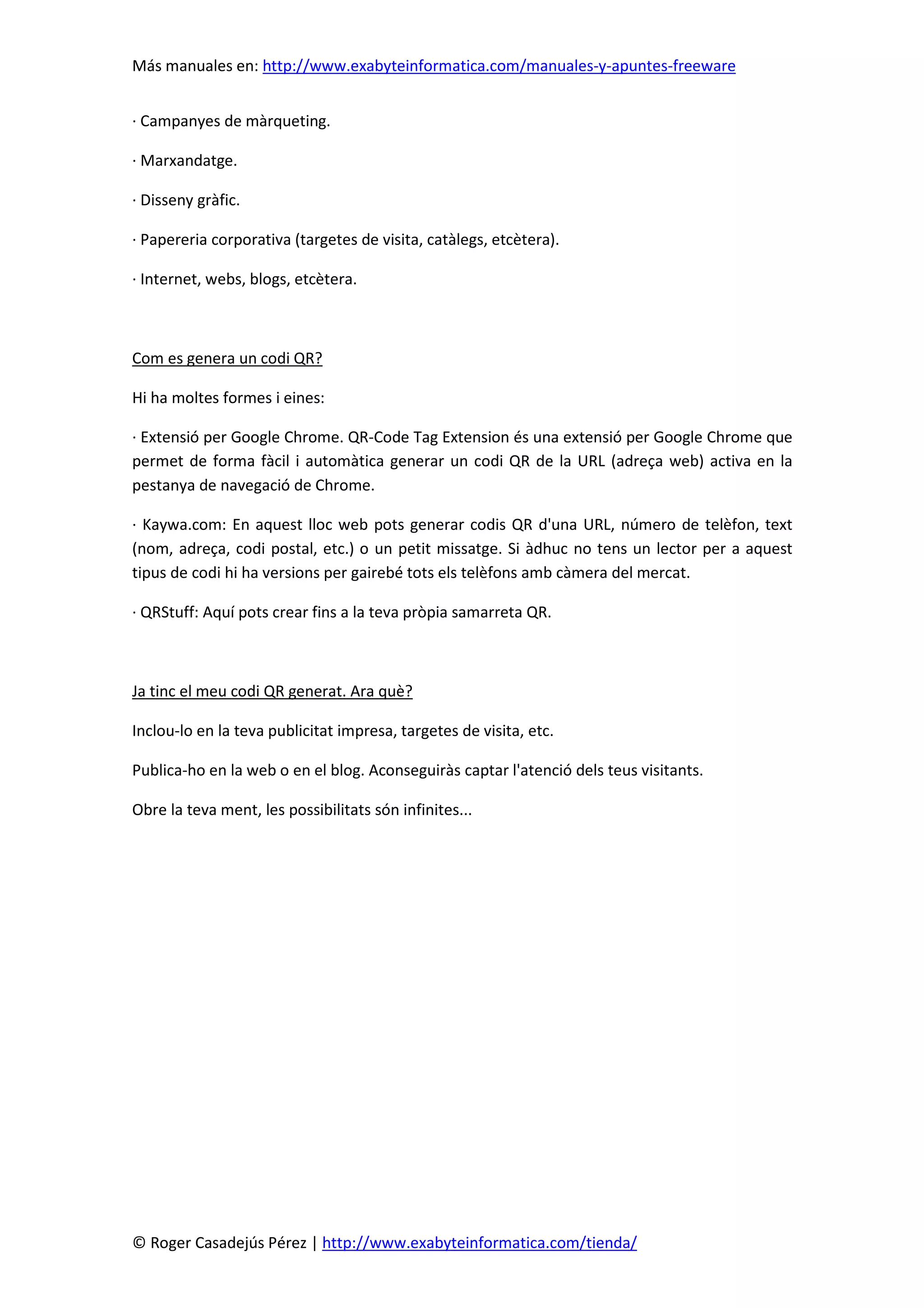 http://www.exabyteinformatica.com/manuales-y-apuntes-freeware © Roger Casadejús Pérez | http://www.exabyteinformatica.com/tienda/ · Campanyes de màrqueting. · Marxandatge. · Disseny gràfic. · Papereria corporativa (targetes de visita, catàlegs, etcètera). · Internet, webs, blogs, etcètera. Com es genera un codi QR? Hi ha moltes formes i eines: · Extensió per Google Chrome. QR-Code Tag Extension és una extensió per Google Chrome que permet de forma fàcil i automàtica generar un codi QR de la URL (adreça web) activa en la pestanya de navegació de Chrome. · Kaywa.com: En aquest lloc web pots generar codis QR d'una URL, número de telèfon, text (nom, adreça, codi postal, etc.) o un petit missatge. Si àdhuc no tens un lector per a aquest tipus de codi hi ha versions per gairebé tots els telèfons amb càmera del mercat. · QRStuff: Aquí pots crear fins a la teva pròpia samarreta QR. Ja tinc el meu codi QR generat. Ara què? Inclou-lo en la teva publicitat impresa, targetes de visita, etc. Publica-ho en la web o en el blog. Aconseguiràs captar l'atenció dels teus visitants. Obre la teva ment, les possibilitats són infinites...
