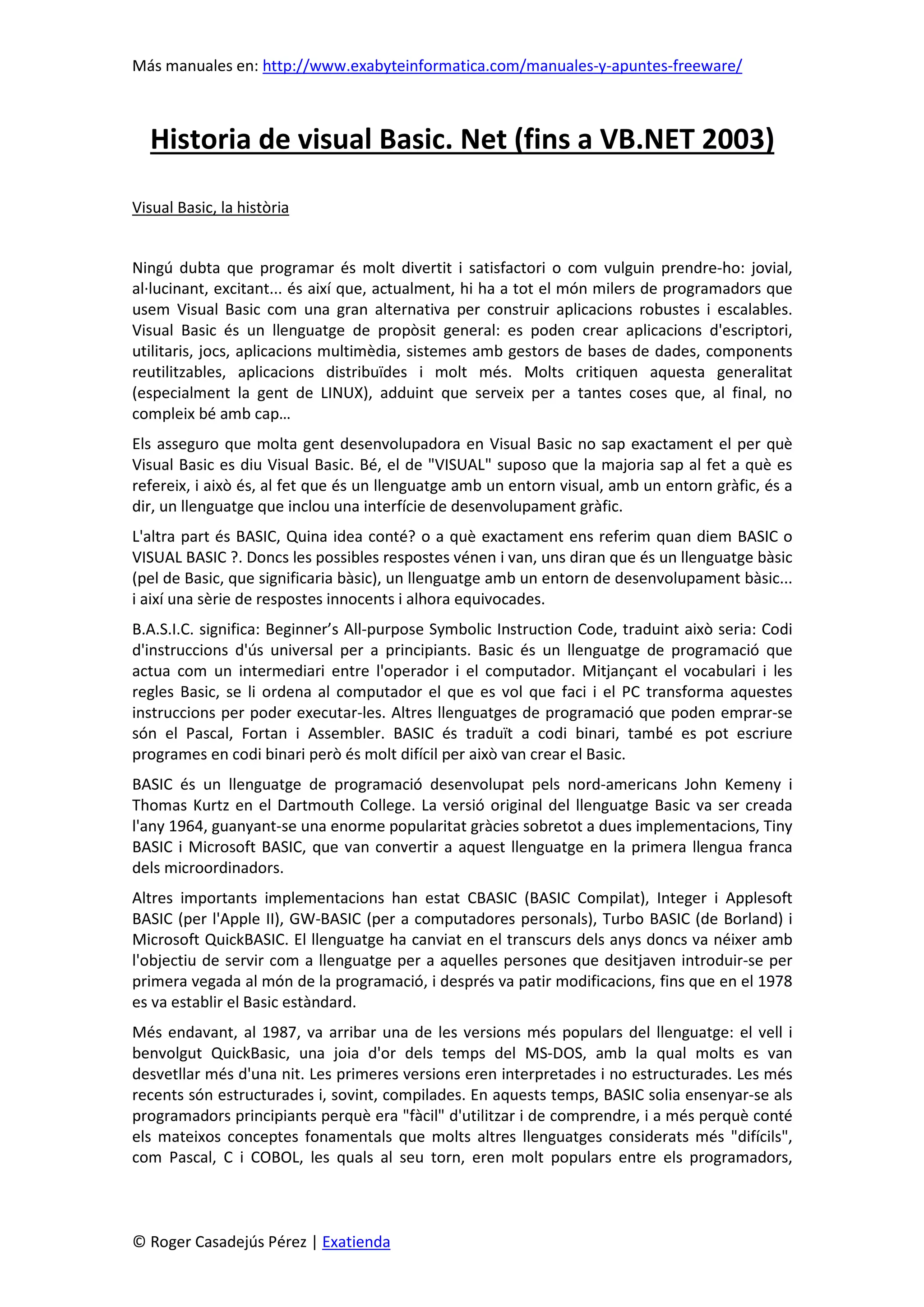 http://www.exabyteinformatica.com/manuales-y-apuntes-freeware/ © Roger Casadejús Pérez | Exatienda Historia de visual Basic. Net (fins a VB.NET 2003) Visual Basic, la història Ningú dubta que programar és molt divertit i satisfactori o com vulguin prendre-ho: jovial, al·lucinant, excitant... és així que, actualment, hi ha a tot el món milers de programadors que usem Visual Basic com una gran alternativa per construir aplicacions robustes i escalables. Visual Basic és un llenguatge de propòsit general: es poden crear aplicacions d'escriptori, utilitaris, jocs, aplicacions multimèdia, sistemes amb gestors de bases de dades, components reutilitzables, aplicacions distribuïdes i molt més. Molts critiquen aquesta generalitat (especialment la gent de LINUX), adduint que serveix per a tantes coses que, al final, no compleix bé amb cap… Els asseguro que molta gent desenvolupadora en Visual Basic no sap exactament el per què Visual Basic es diu Visual Basic. Bé, el de "VISUAL" suposo que la majoria sap al fet a què es refereix, i això és, al fet que és un llenguatge amb un entorn visual, amb un entorn gràfic, és a dir, un llenguatge que inclou una interfície de desenvolupament gràfic. L'altra part és BASIC, Quina idea conté? o a què exactament ens referim quan diem BASIC o VISUAL BASIC ?. Doncs les possibles respostes vénen i van, uns diran que és un llenguatge bàsic (pel de Basic, que significaria bàsic), un llenguatge amb un entorn de desenvolupament bàsic... i així una sèrie de respostes innocents i alhora equivocades. B.A.S.I.C. significa: Beginner’s All-purpose Symbolic Instruction Code, traduint això seria: Codi d'instruccions d'ús universal per a principiants. Basic és un llenguatge de programació que actua com un intermediari entre l'operador i el computador. Mitjançant el vocabulari i les regles Basic, se li ordena al computador el que es vol que faci i el PC transforma aquestes instruccions per poder executar-les. Altres llenguatges de programació que poden emprar-se són el Pascal, Fortan i Assembler. BASIC és traduït a codi binari, també es pot escriure programes en codi binari però és molt difícil per això van crear el Basic. BASIC és un llenguatge de programació desenvolupat pels nord-americans John Kemeny i Thomas Kurtz en el Dartmouth College. La versió original del llenguatge Basic va ser creada l'any 1964, guanyant-se una enorme popularitat gràcies sobretot a dues implementacions, Tiny BASIC i Microsoft BASIC, que van convertir a aquest llenguatge en la primera llengua franca dels microordinadors. Altres importants implementacions han estat CBASIC (BASIC Compilat), Integer i Applesoft BASIC (per l'Apple II), GW-BASIC (per a computadores personals), Turbo BASIC (de Borland) i Microsoft QuickBASIC. El llenguatge ha canviat en el transcurs dels anys doncs va néixer amb l'objectiu de servir com a llenguatge per a aquelles persones que desitjaven introduir-se per primera vegada al món de la programació, i després va patir modificacions, fins que en el 1978 es va establir el Basic estàndard. Més endavant, al 1987, va arribar una de les versions més populars del llenguatge: el vell i benvolgut QuickBasic, una joia d'or dels temps del MS-DOS, amb la qual molts es van desvetllar més d'una nit. Les primeres versions eren interpretades i no estructurades. Les més recents són estructurades i, sovint, compilades. En aquests temps, BASIC solia ensenyar-se als programadors principiants perquè era "fàcil" d'utilitzar i de comprendre, i a més perquè conté els mateixos conceptes fonamentals que molts altres llenguatges considerats més "difícils", com Pascal, C i COBOL, les quals al seu torn, eren molt populars entre els programadors,