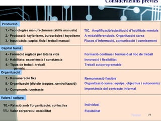 TREBALL EN XARXATREBALL INDUSTRIAL Producció Capital humà Organització Valors i cultura 1.- Tecnologies manufactureres (skills manuals) 2.- Producció: taylorisme, burocràcies i toyotisme 3.- Input bàsic: capital físic i treball manual TIC. Amplificació/substitució d’habilitats mentals A mida/diferenciada. Organització xarxa Fluxos d’informació, comunicació i coneixement 4.- Formació reglada per tota la vida 5.- Habilitats: experiència i constància 6.- Tipus de treball: treball genèric 7.- Remuneració fixa 8.- Organització (divisió tasques, centralització) 9.- Compromís: contracte 10.- Relació amb l’organització: col·lectiva 11.- Valor corporatiu: estabilitat Formació contínua i formació al lloc de treball Innovació i flexibilitat Treball autoprogramable Remuneració flexible Organització xarxa: equips, objectius i autonomia) Importància del contracte informal Individual Flexibilitat Tornar 1/9 Consideracions prèvies Consolidació del treball en xarxa