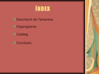 Organigrama JUNTA GENERALACCIONISTES Departament LOGÍSTICA MAGATZEM Laura Massegú Departament VENDES COMERCIAL Natàlia Llopart Departament ADMINISTRADORS Verónica Bernadó Departament HUMANS Jordi Gallart DIRECCIÓ Núria Costas Departament PUBLICITAT José Andrés