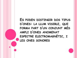 Es poden distingirdos tipus d’ones: la llum visible, que forma part d’un conjunt més ampli d’ones anomenat espectre electromagnètic, i les ones sonores