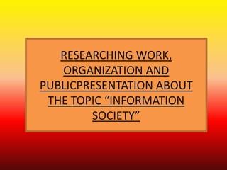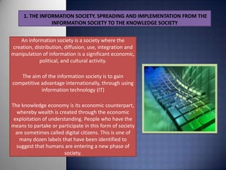An information society is one where information creation, distribution, use and manipulation is a major economic and cultural activity. The goal is to gain competitive advantage using information technology. The knowledge economy is the economic counterpart, creating wealth through exploiting knowledge. People who participate are sometimes called digital citizens.