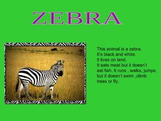 The document describes 18 different animals: zebra, iguana, anteater, spider, dolphin, tiger, elephant, frog, whale, seal, eagle, lion, flamingo, ant, and otter. It provides details about each animal's physical description, habitat, diet, and abilities. Key details provided include whether each animal lives on land or water, eats meat or plants, and can swim, fly or climb trees.