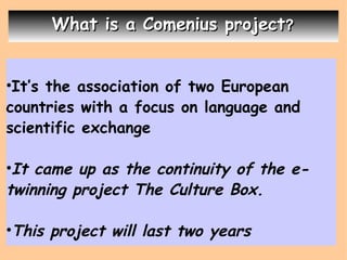 This document summarizes a two-year Comenius project between schools in Berja, Spain and North Yorkshire, UK focused on language exchange, science, and culture. Students and teachers from Graham School in North Yorkshire will visit IES Sierra de Gádor in Berja for 10 days in April 2010. During this exchange and the following year, students will collaborate on bilingual materials about the local landscapes and produce documentaries about their visits to share their experiences. The goal is to promote cultural and scientific understanding between the two regions.