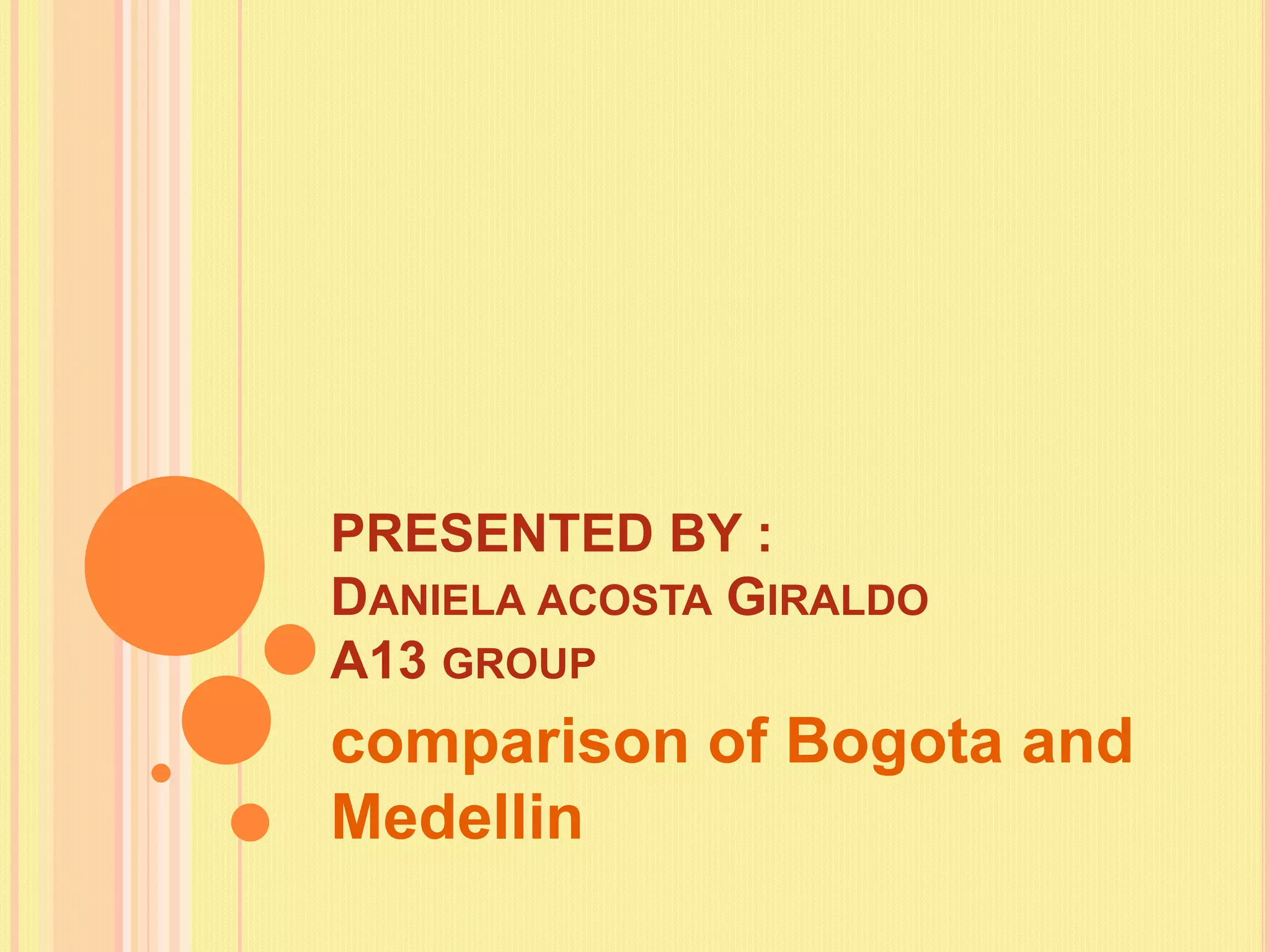 Bogota and Medellin are the two largest cities in Colombia. Bogota, the capital, is located in a mountainous region with an average temperature of 14°C that varies between 9-22°C throughout the year. It has distinct wet and dry seasons. Medellin, also known as the "City of Eternal Spring", has a pleasant, mild climate with an average of 22°C year-round. It has a strong economy based on industry, exports, and tourism. Both cities are located in mountainous areas with varying climates and scenery.