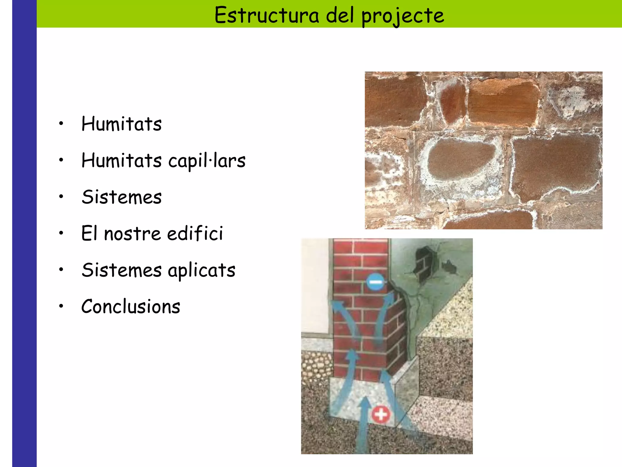 La humitat capil·lares deu a que els materials absorbeixen l’aigua del terreny a través de la fonamentació o murs. Aquesta ascendeix per la xarxa de capil·lars depenent de la forma, grandaria, estructura dels porus, pressió atmosfèrica i el potencial elèctric del mur. Aquest aigua transporta substancies salines que al ascendir s’evaporen i cristalitzen, tacant tant terres com parets i impregnant l’ambient d’aire humit. Humitats Humitats capil·lars Sistemes El nostre edifici Sistemes aplicats Conclusions Humitats capil·lars