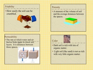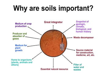 The document discusses the use and importance of soil as a natural resource, highlighting its various layers, properties, and roles in supporting life. It emphasizes the necessity of soil conservation practices due to problems like erosion, degradation, and contamination. Solutions for maintaining healthy soil include sustainable agricultural methods, tree planting, and managing livestock grazing.