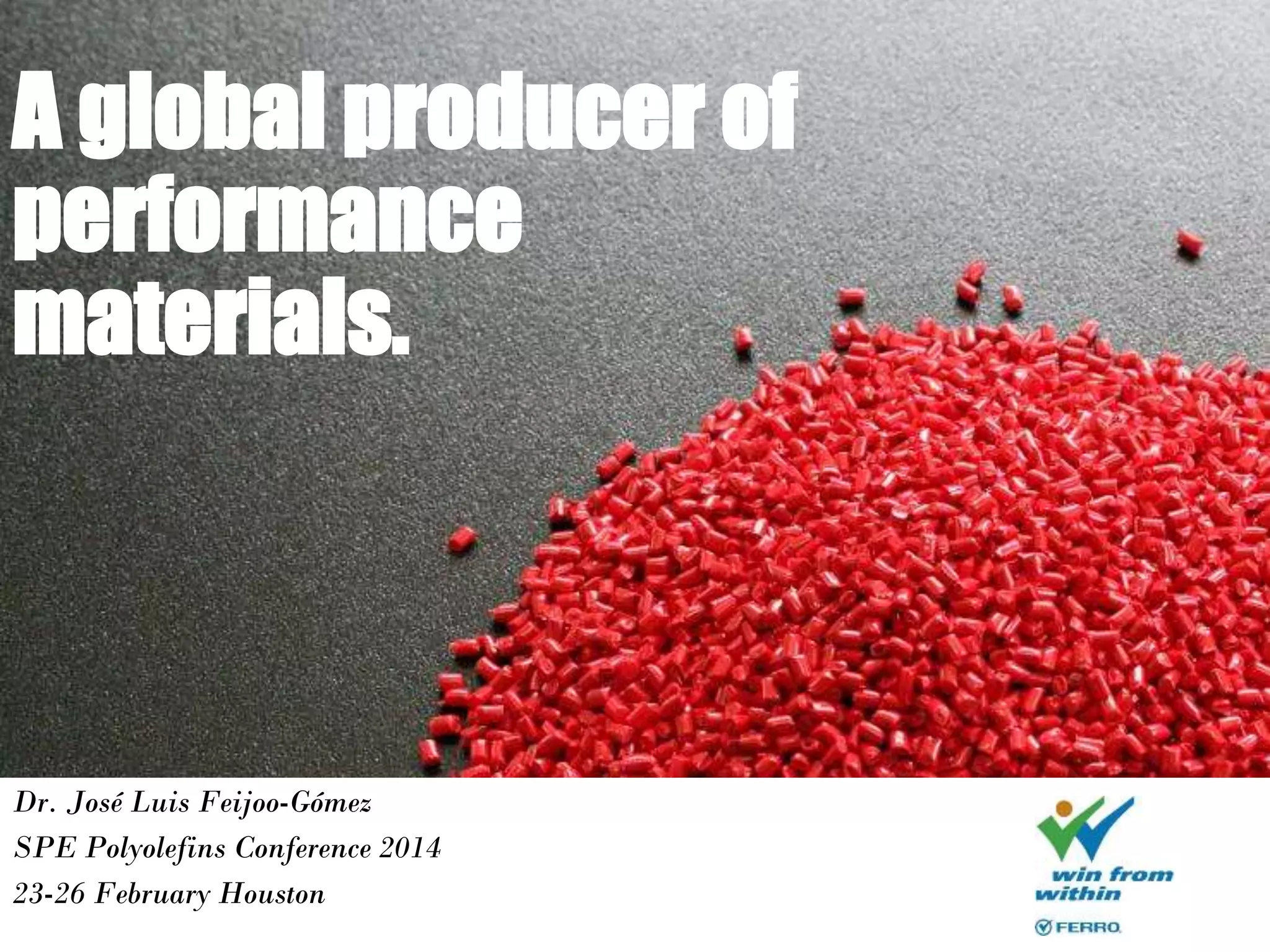 Dr. José Luis Feijoo-Gómez presented at the SPE Polyolefins Conference in February 2014 in Houston. He discussed OPTUM®, an innovative masterbatch technology from Ferro that uses non-nanosized lamellar clays to reduce the water vapor transmission rate of polypropylene-based materials used in food packaging. This allows for reduced EVOH content while maintaining barrier performance, even after thermal processing like sterilization. OPTUM® was shown to decrease the water uptake of PP films by over 50% compared to unmodified PP, protecting the barrier properties of EVOH layers during packaging shelf life.