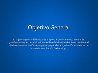 The document discusses the design and implementation of an automatic post categorization prototype for Betazeta Networks S.A. using text mining. The objectives are to support the manual processing of large volumes of blog posts by developing a solution for automatic categorization. This will involve selecting historical data and models, establishing evaluation methods, designing the categorization process, and implementing a prototype for users to input data and the company to process, filter, and publish posts according to business criteria.