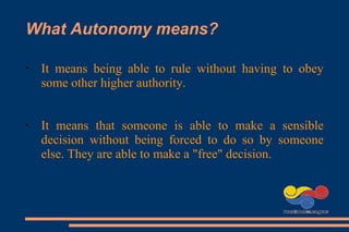 The document discusses autonomy in learning and provides tips for becoming an autonomous learner. It defines autonomy as being able to make decisions without obeying external authority and explains that autonomous learners can make free choices. It then outlines various learning techniques like reading, listening, writing, and using memory effectively. These include taking notes, summarizing, asking questions, and repeating information to memorize it. The document also stresses the importance of attitude, motivation, willpower, relationships, and organization in autonomous learning.