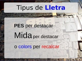 El títol ésla porta d’entrada La mida de la lletra indica jerarquies 1.1. Als títols serà més grans que al text 1.2. La numeració ordena l’explicació 1.2.1. Però no cal abusar dels subtemes 1.2.2. Ens podríem perdre entre la numeració 1.3. Els bullet points també són útils 1.3.1. Sobretot, per fer llistes i enumeracions 1.3.2. Però no se n’ha d’abusar