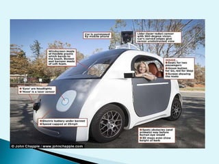 This document discusses driverless cars, including their components, functions, working, advantages and disadvantages. Driverless cars use sensors like radar, lidar, computer vision and GPS to detect their surroundings and navigate roads autonomously. They have control systems that analyze sensor data to identify other vehicles. Key components are sensors, a control unit and actuators that allow the computer to safely operate the vehicle. While driverless cars could solve traffic issues and reduce labor costs, challenges include relying on accurate high-quality maps and requiring sophisticated AI and sensing technologies.