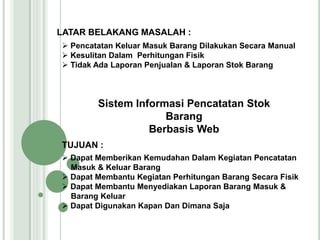 Dokumen ini menjelaskan perancangan dan pembuatan sistem informasi pencatatan stok barang berbasis web untuk UD. Kami Jaya yang bertujuan untuk memperbaiki pencatatan barang yang dilakukan secara manual. Sistem ini menyediakan kemudahan dalam transaksi, laporan, dan manajemen data barang, serta diharapkan dapat mengatasi masalah yang ada pada pengelolaan stok.