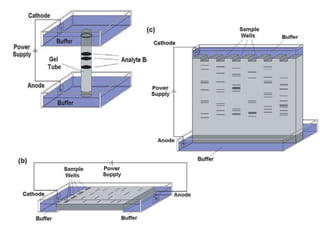 Dokumen tersebut membahas tentang elektroforesis zona, yang merupakan teknik bioanalitik untuk memisahkan dan mengidentifikasi biomolekul berdasarkan perbedaan muatan dan ukuran molekulnya di bawah pengaruh medan listrik. Dokumen tersebut menjelaskan prinsip, jenis media, faktor yang mempengaruhi, dan aplikasi dari teknik elektroforesis zona ini.