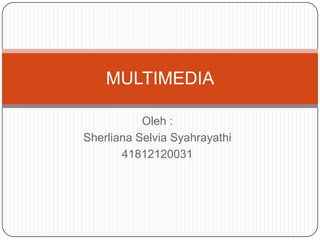 Multimedia adalah interaksi antara berbagai media seperti teks, gambar, suara, animasi dan video. Aplikasi multimedia meliputi pendidikan, hiburan, medis dan arsitektur. Perangkat keras yang dibutuhkan antara lain kartu suara, speaker dan mikrofon. Unsur-unsur multimedia mencakup teks, suara, gambar statis, animasi dan video. Perangkat lunak seperti Authorware digunakan untuk membuat program multimedia. Virtual reality menggunakan perangkat seperti sar