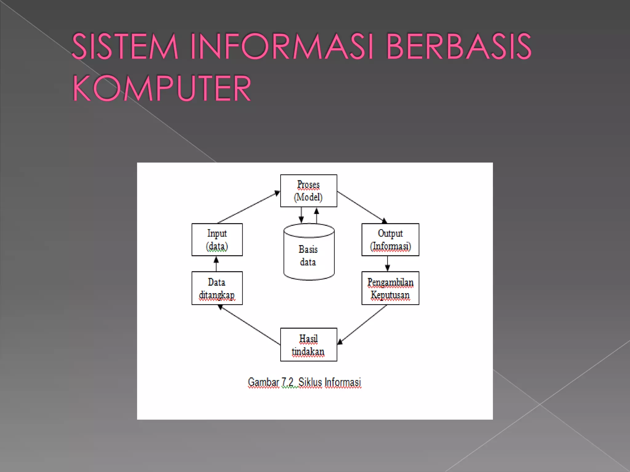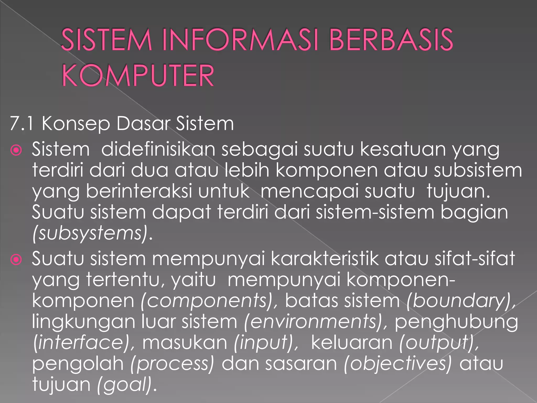 Dokumen ini menguraikan konsep dasar sistem, klasifikasi sistem, dan aspek-aspek sistem berbasis komputer. Selain itu, dibahas tentang siklus informasi, kualitas informasi, serta sumber daya yang terlibat dalam sistem informasi, termasuk manusia, hardware, dan software. Juga disoroti manfaat dan risiko dari end user computing dalam pengembangan sistem informasi.