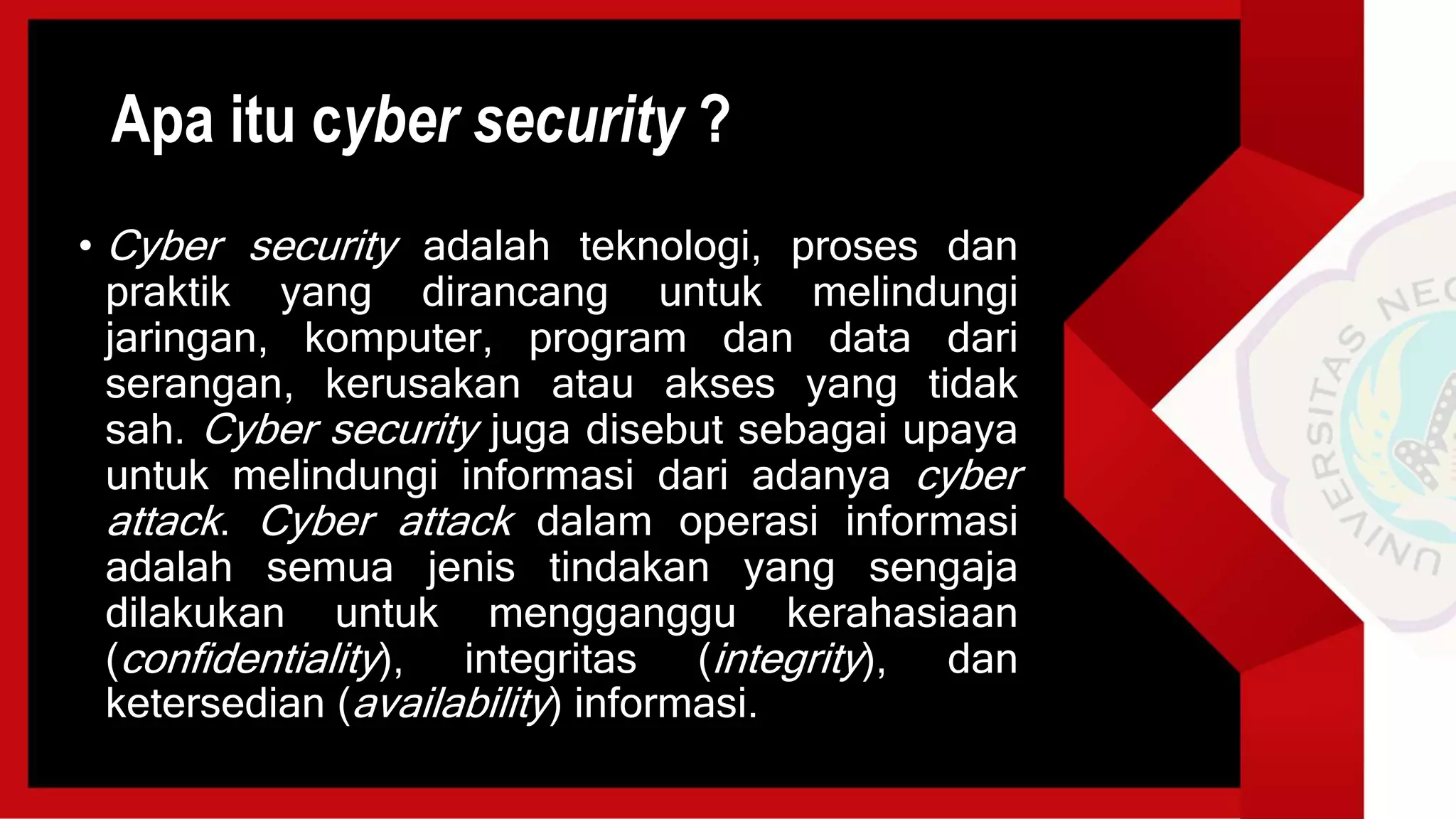 Dokumen tersebut membahas tentang cyber security, yang didefinisikan sebagai teknologi, proses, dan praktik yang dirancang untuk melindungi jaringan, komputer, program, dan data dari serangan atau akses yang tidak sah. Dokumen tersebut juga membahas berbagai aspek cyber security seperti kebijakan keamanan, praktik keamanan pengguna, keamanan situs web, keamanan jaringan, dan manfaat cyber security untuk melindungi reputasi perusahaan
