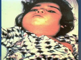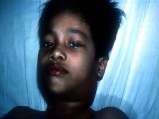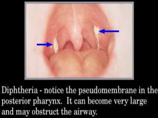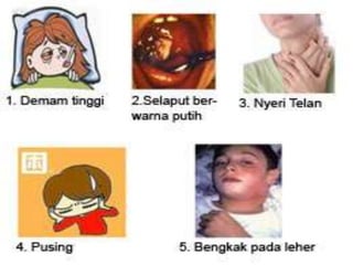 Difteri adalah infeksi saluran pernapasan akut yang disebabkan oleh corynebacterium diphteriae, umumnya menyerang anak-anak dan dapat menular melalui air ludah dan makanan terkontaminasi. Gejala termasuk demam tinggi, nyeri telan, dan selaput putih keabu-abuan pada tenggorokan. Pencegahan utama meliputi imunisasi, menjaga kebersihan, dan menghindari kontak dengan penderita.