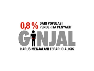 (1) Dokumen tersebut membahas tentang penyakit gagal ginjal dan fasilitas dialisis di Indonesia; (2) Terdapat 110.000 penderita gagal ginjal di Indonesia namun hanya 13% yang menjalani terapi dialisis; (3) Jumlah fasilitas dan mesin dialisis di Indonesia meningkat namun masih kurang untuk memenuhi kebutuhan penderita.