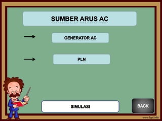 Dokumen ini menjelaskan tentang energi listrik, definisi arus listrik, dan perbedaan antara arus searah (DC) dan arus bolak-balik (AC). Energi listrik dihasilkan dari berbagai sumber dan sangat penting bagi kehidupan manusia. Penggunaan arus bolak-balik sebagai sumber listrik utama dipengaruhi oleh faktor ekonomi dibandingkan arus searah.
