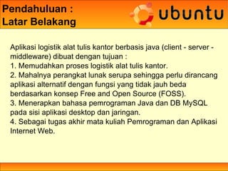 Dokumen ini menjelaskan pengembangan aplikasi logistik alat tulis kantor berbasis Java dengan arsitektur client-server-middleware. Aplikasi ini bertujuan untuk memudahkan proses logistik dan menyediakan alternatif perangkat lunak yang bebas dan open source, dengan fitur yang berbeda untuk pengguna admin dan non-admin. Proyek ini mencakup spesifikasi perangkat keras dan perangkat lunak yang diperlukan, serta tahapan pengembangan dan pengujian yang telah dilakukan.