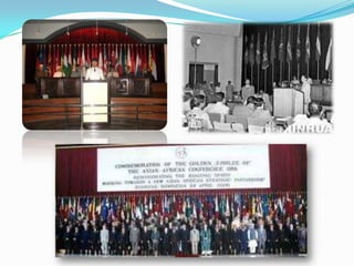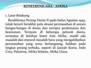 Dokumen tersebut merangkum latar belakang, ide, dan persiapan Konferensi Asia Afrika tahun 1955. Konferensi ini diadakan untuk membahas masalah-masalah bersama negara-negara Asia dan Afrika serta mempromosikan kerja sama antarnegara. Ide konferensi muncul setelah pertemuan di Kolombo tahun 1954 dan dipersiapkan melalui serangkaian pertemuan di Bogor dan New Delhi.