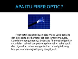 Dokumen ini menjelaskan tentang fiber optik yang merupakan kaca murni yang digunakan untuk mengantarkan data digital melalui sinar dengan metode total internal reflection. Selain keuntungan seperti biaya yang lebih murah dan kapasitas yang lebih besar, terdapat juga kelemahan seperti biaya peralatan yang mahal dan kebutuhan untuk perbaikan oleh tenaga ahli. Selain itu, dijelaskan pula berbagai jenis konektor yang umum digunakan dalam sistem fiber optik.