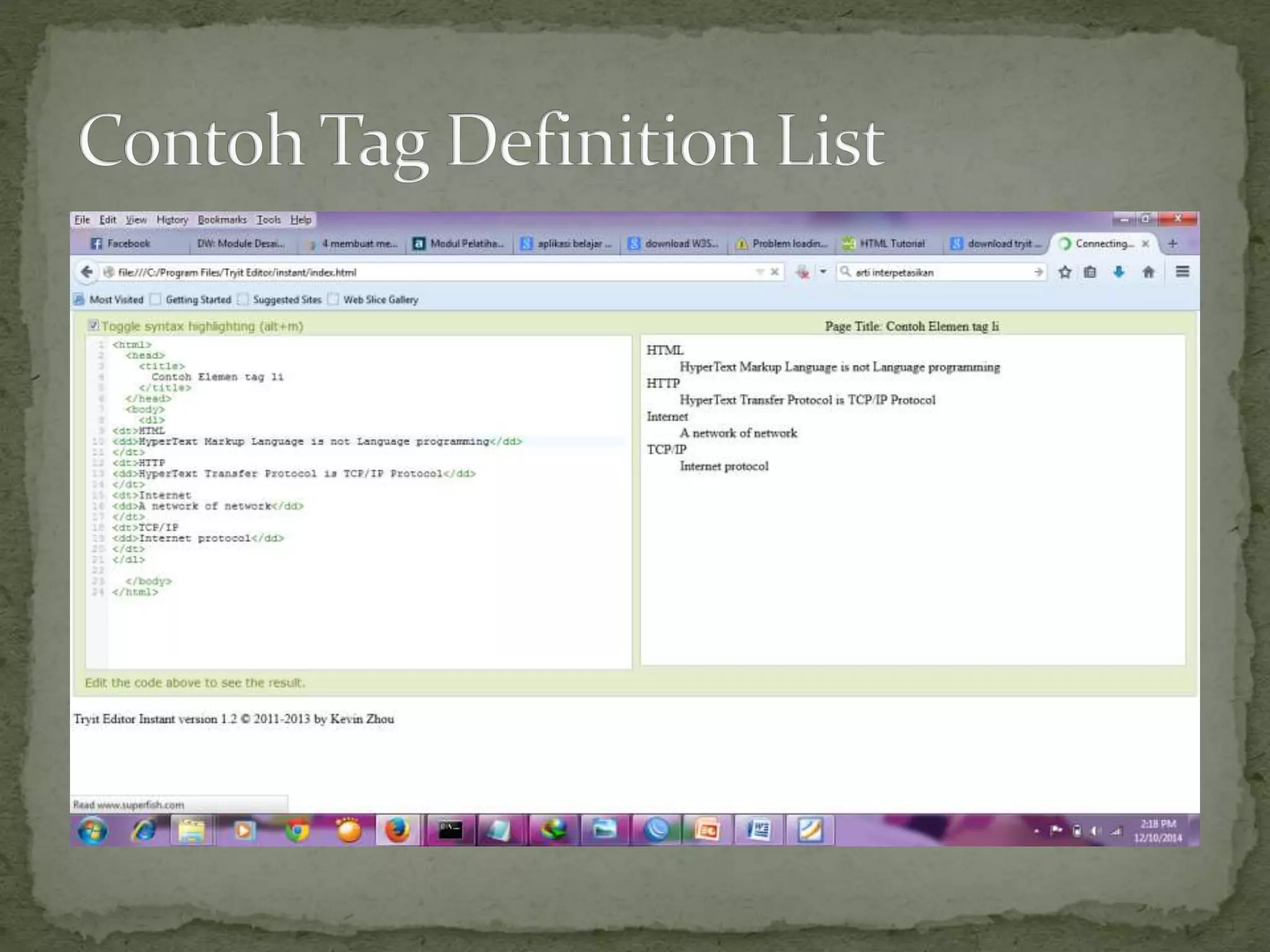 <DL> … </DL>. Didalam tag Definition List terdapat tag Definition Term