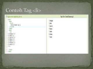 Dokumen tersebut membahas konsep dasar HTML dan elemen-elemennya, termasuk elemen pada tag head seperti title dan meta, serta elemen pada tag body seperti heading, paragraph, dan list.