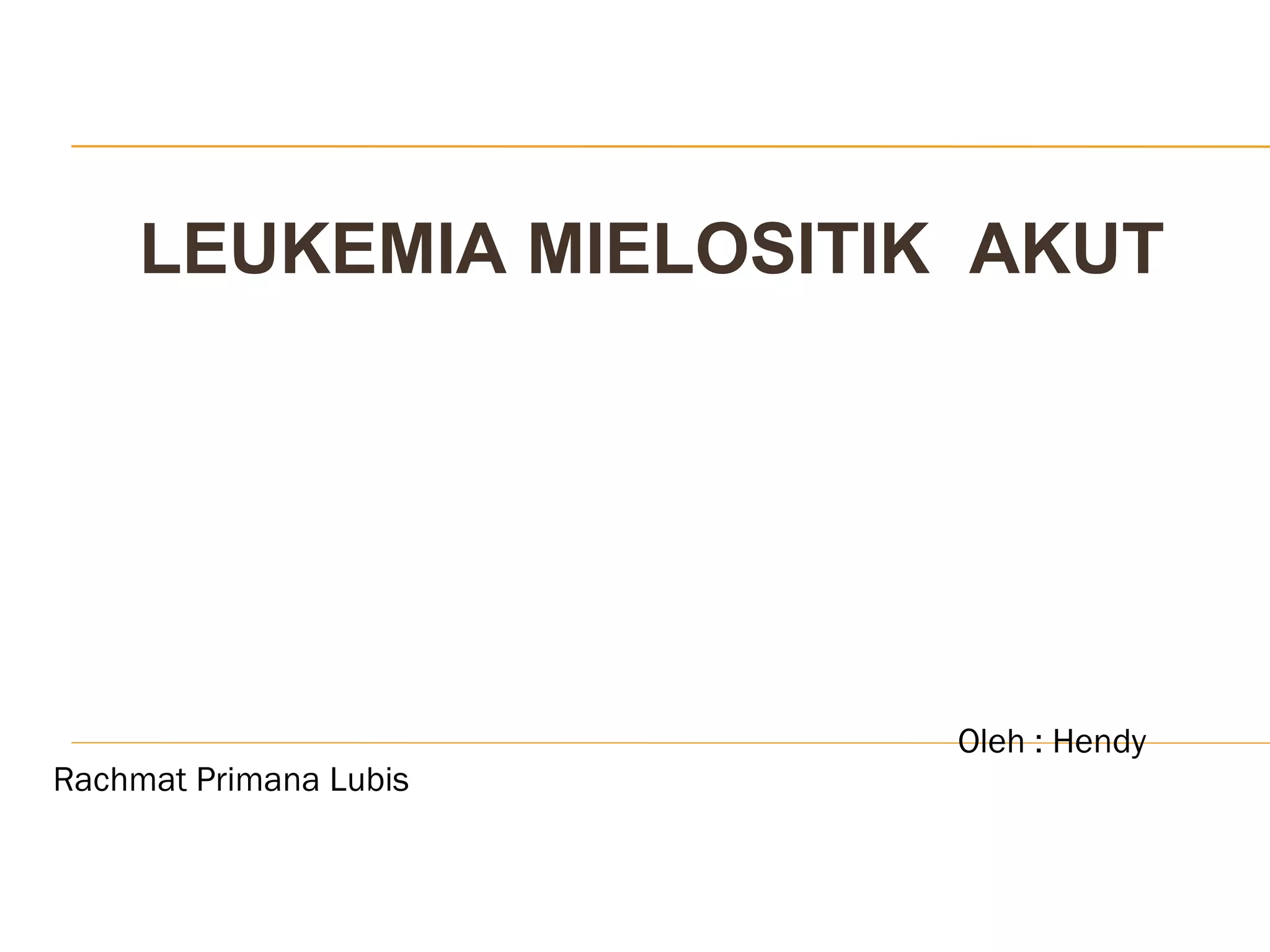 Pasien laki-laki 42 tahun dirawat karena demam, lemas, sakit kepala, dan mual, dengan hasil pemeriksaan fisik menunjukkan hepatosplenomegali dan anemia. Hasil pemeriksaan darah mengarah pada diagnosis leukemia mielositik akut, sedangkan pemeriksaan penunjang menunjukkan leukositosis dan penurunan sel darah merah serta trombosit. Pengobatan pasien mencakup infus dan medikasi untuk manajemen gejala serta transfusi darah.