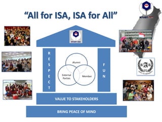 The document provides a summary of NTUST-ISA's activities and finances for 2012-2013. It outlines the responsibilities and activities of each division - Academic, Caring & Household, Inventory & Culture, Media & Relations, and Talent & Interest. Key activities included Mandarin courses, seminars, cultural performances, trips, sports events, and social gatherings. Finances showed total income of NTD 77,100 mainly from membership fees and performances, and expenses of NTD 43,534 across divisions for events and reimbursements. The report evaluates each activity and provides inputs to guide future work.