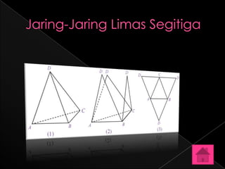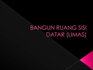 Dokumen tersebut membahas tentang pengertian limas, unsur-unsur limas seperti alas, rusuk, sisi, dan volume limas. Juga dijelaskan rumus-rumus untuk menghitung luas permukaan dan volume limas berdasarkan bentuk alasnya. Terdapat beberapa soal latihan untuk mengaplikasikan rumus-rumus tersebut.