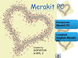 Dokumen ini menjelaskan langkah-langkah merakit PC dan komponen-komponennya, termasuk casing, power supply, motherboard, RAM, processor, hard disk, dan lainnya. Setiap komponen diuraikan fungsinya dan berbagai jenis yang tersedia, serta petunjuk pemasangan yang tepat untuk masing-masing bagian. Selain itu, terdapat informasi spesifikasi penting dari berbagai jenis perangkat keras yang digunakan dalam merakit komputer.