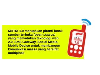 Mitra 1.0 adalah sistem informasi berbasis SMS dan mikroblog yang mengintegrasikan teknologi web 2.0 untuk membangun komunikasi massa interaktif dengan pengguna handphone di Indonesia. Sistem ini memungkinkan pengelolaan konten dan laporan kolaboratif yang melibatkan berbagai stakeholder. Pentingnya keberhasilan sistem ini tergantung pada penggunaannya oleh masyarakat dan metode pelaksanaannya.
