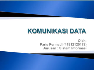 Dokumen ini membahas konsep dasar komunikasi data, termasuk media dan tipe transmisi, serta bentuk sistem komunikasi. Terdapat penjelasan mengenai elemen komunikasi data, kapasitas channel, dan perangkat keras yang digunakan, serta berbagai aplikasi dan efisiensi dalam transmisi data. Selain itu, dokumen ini juga menyoroti pentingnya kualitas saluran dan sistem deteksi/koreksi kesalahan.