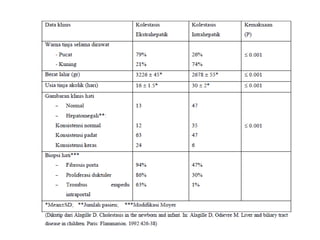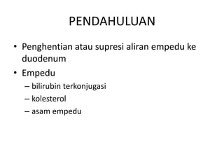 Dokumen ini membahas kolestasis pada neonatus, termasuk etiologi, manifestasi klinis, diagnosis, dan tatalaksana yang tepat. Kolestasis ditandai dengan peningkatan bilirubin terkonjugasi, ikterus, dan kelainan lainnya yang membutuhkan perhatian medis segera. Deteksi dini sangat penting untuk mencegah komplikasi yang serius seperti sirosis dan kematian pada bayi.
