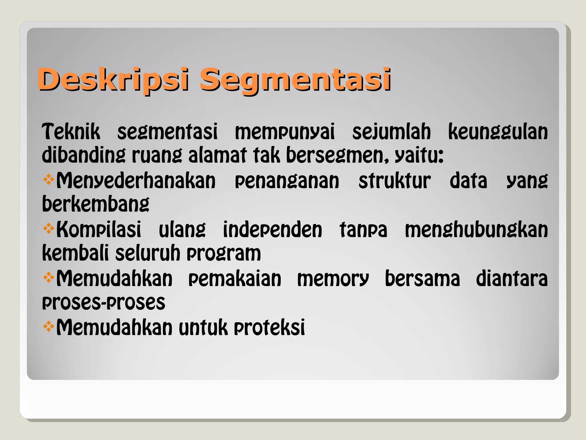 Dokumen ini membahas tentang segmentasi dalam struktur data, menjelaskan keunggulan teknik segmentasi dibandingkan ruang alamat tak bersegmen, seperti penanganan struktur data yang lebih sederhana dan pemakaian memory bersama. Arsitektur segmentasi meliputi alamat logika yang terdiri dari nomor segmen dan offset. Selain itu, teknik kombinasi segmentasi juga diuraikan, di mana ruang alamat dibagi menjadi segmen dan page untuk efisiensi penggunaan memori.