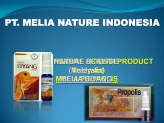Presentasi ini menawarkan kesempatan bisnis melalui jaringan multi level marketing dengan menjual produk herbal seperti propolis dan biyang. Peserta didaftarkan dengan biaya Rp. 30.000 dan pembelian produk pertama Rp. 550.000. Peserta akan mendapat bonus sponsor, kepemimpinan, dan unilevel secara otomatis berdasarkan jaringan yang dibangun.