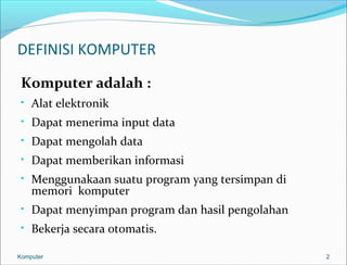 Komputer adalah alat elektronik yang dapat menerima input data, mengolah data, dan memberikan informasi berdasarkan program yang disimpan di memori. Komputer melakukan siklus pengolahan data melalui tahapan input, pengolahan, dan output untuk menghasilkan informasi dari data. Siklus ini terus berkembang dengan ditambahkannya tahapan seperti origination, distribusi, dan penyimpanan.