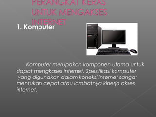 Dokumen ini membahas perangkat keras yang diperlukan untuk mengakses internet, termasuk spesifikasi komputer, jenis-jenis monitor, RAM, prosesor, dan modem. Selain itu, dijelaskan juga mengenai komponen lain yang mendukung akses internet seperti saluran telepon, satelit, server, dan kartu jaringan. Penjelasan mencakup fungsi dan karakteristik masing-masing perangkat yang memengaruhi kinerja koneksi internet.